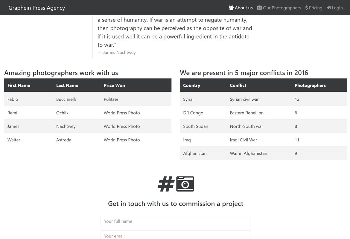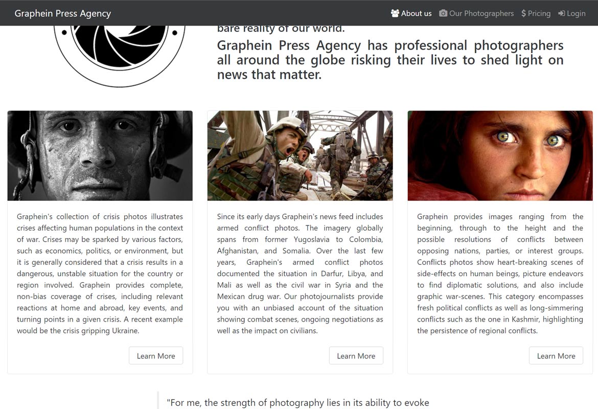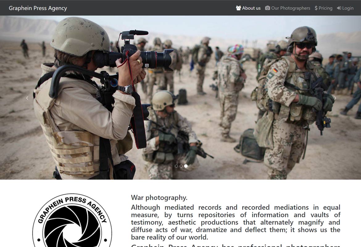 The Graphein Press Agency's website is made for a professional grade press agency with a strong focus on photographical work. It was created to showcase the use and mastery of the popular CSS bootstrap framework (in this example, Bootstrap alpha 4 was used).