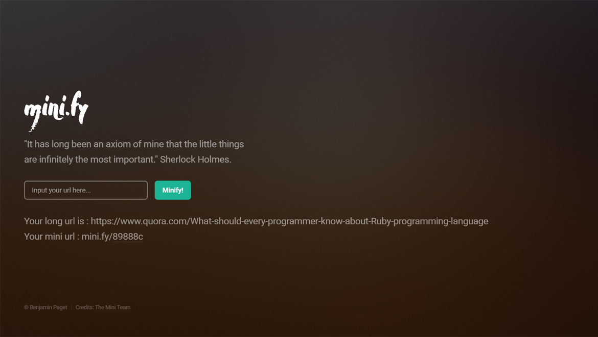 Mini.fy is a Bitly-like website that was created as a Ruby-on-Rails demo project during the 2016 Next Academy Bootcamp. The backend was coded in RoR and demonstrates the ability to use classic CRUD functions, while linked to a MySQL database.